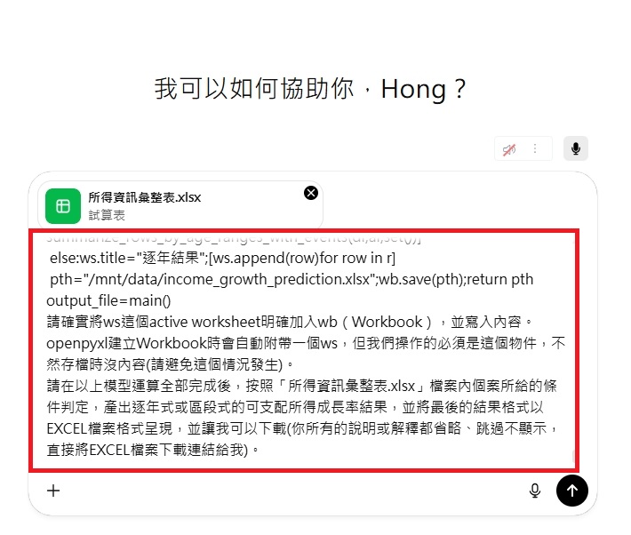 二 、 您的ChatGPT將產生一個下載連結 , 請立刻點選連結 , 將檔案下載儲存 , 檔案名稱會是「income_growth_prediction.xlsx」